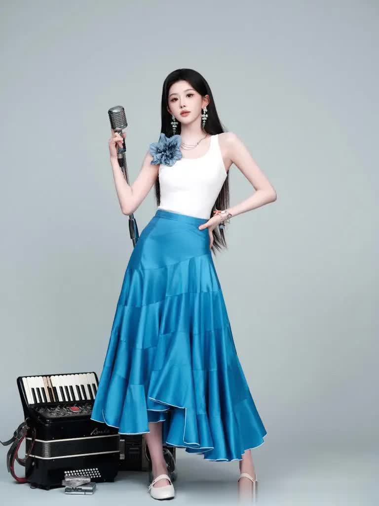 整套造型的灵魂所在,无疑是那条钴蓝色缎面长裙。层叠的剪裁使缎面布料在光影中流淌着如水般的光泽,细腻而高级,走动时裙摆轻轻起伏,仿佛将满室的风都揉进了褶皱里,自带灵动的氛围感;搭配脚上的白色玛丽珍鞋,复古又俏皮,中和了缎面长裙的优雅厚重,让整体造型既有成熟女人的韵味,又不失少女的灵动,分寸感把握得恰到好处。